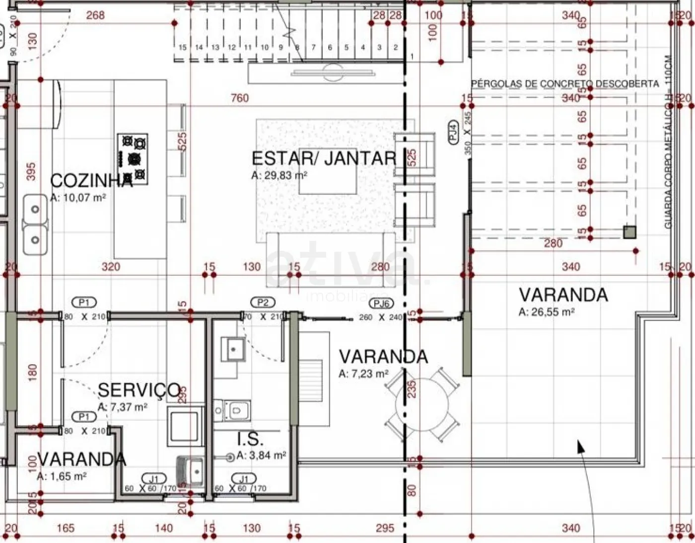 - Varanda externa descoberta com pergolado de 22,4 metros quadrados