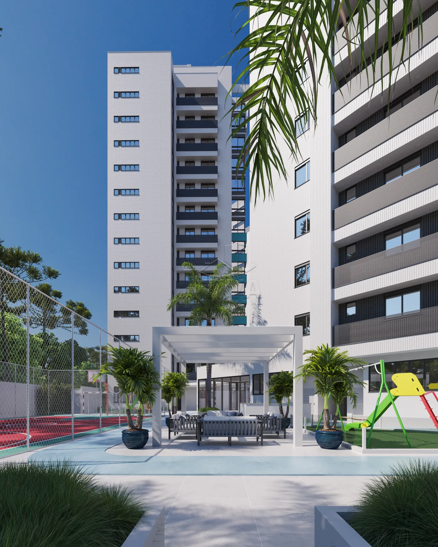 O conjunto é composto de 3 Torres dispostas de maneira a garantir a privacidade de cada apartamento, mas num formato que abraça as áreas de piscina, convivência e acesso, numa definição ímpar de espaço, além de conferir maior controle e segurança ao empreendimento.