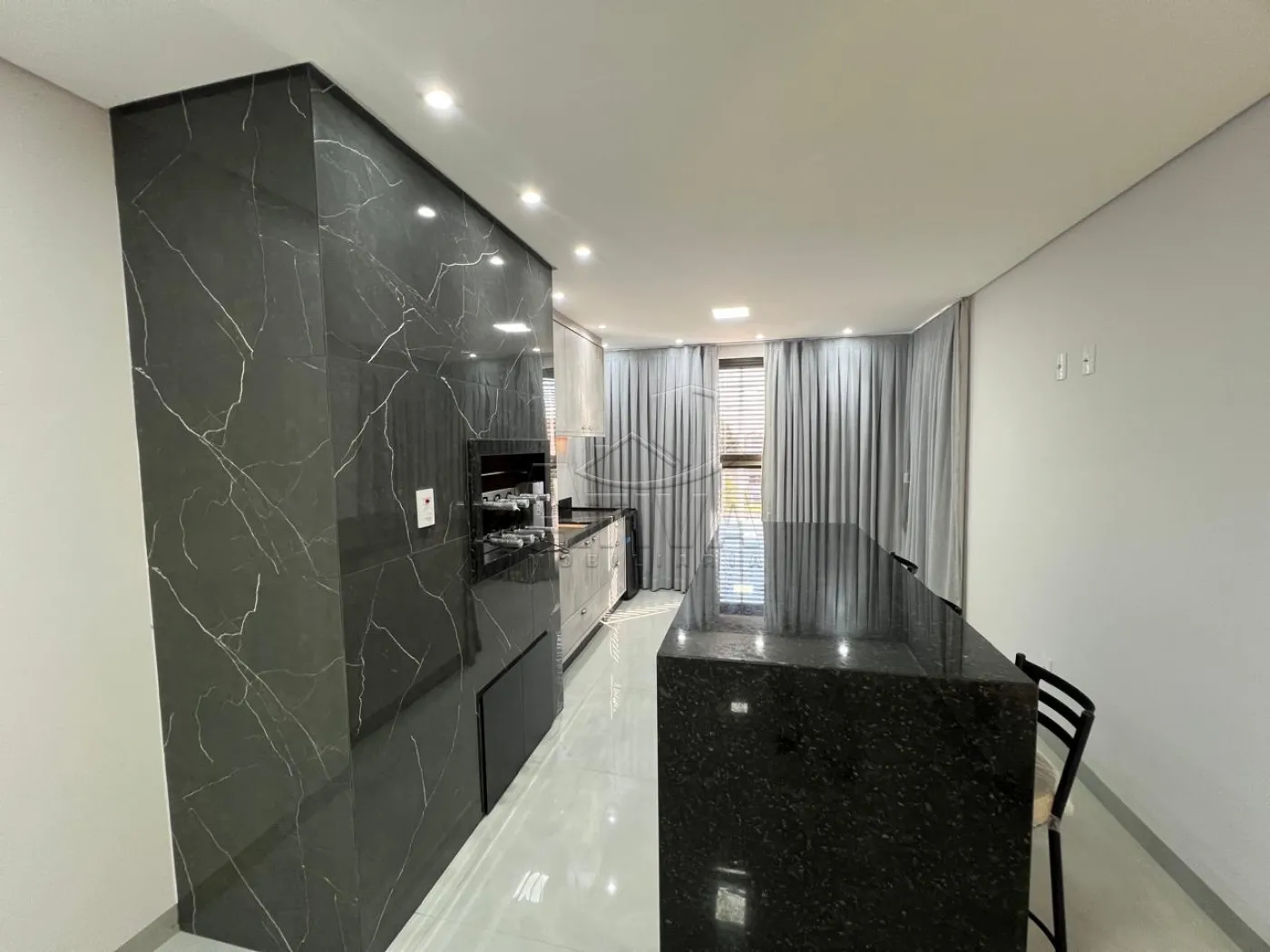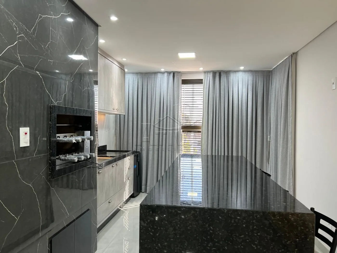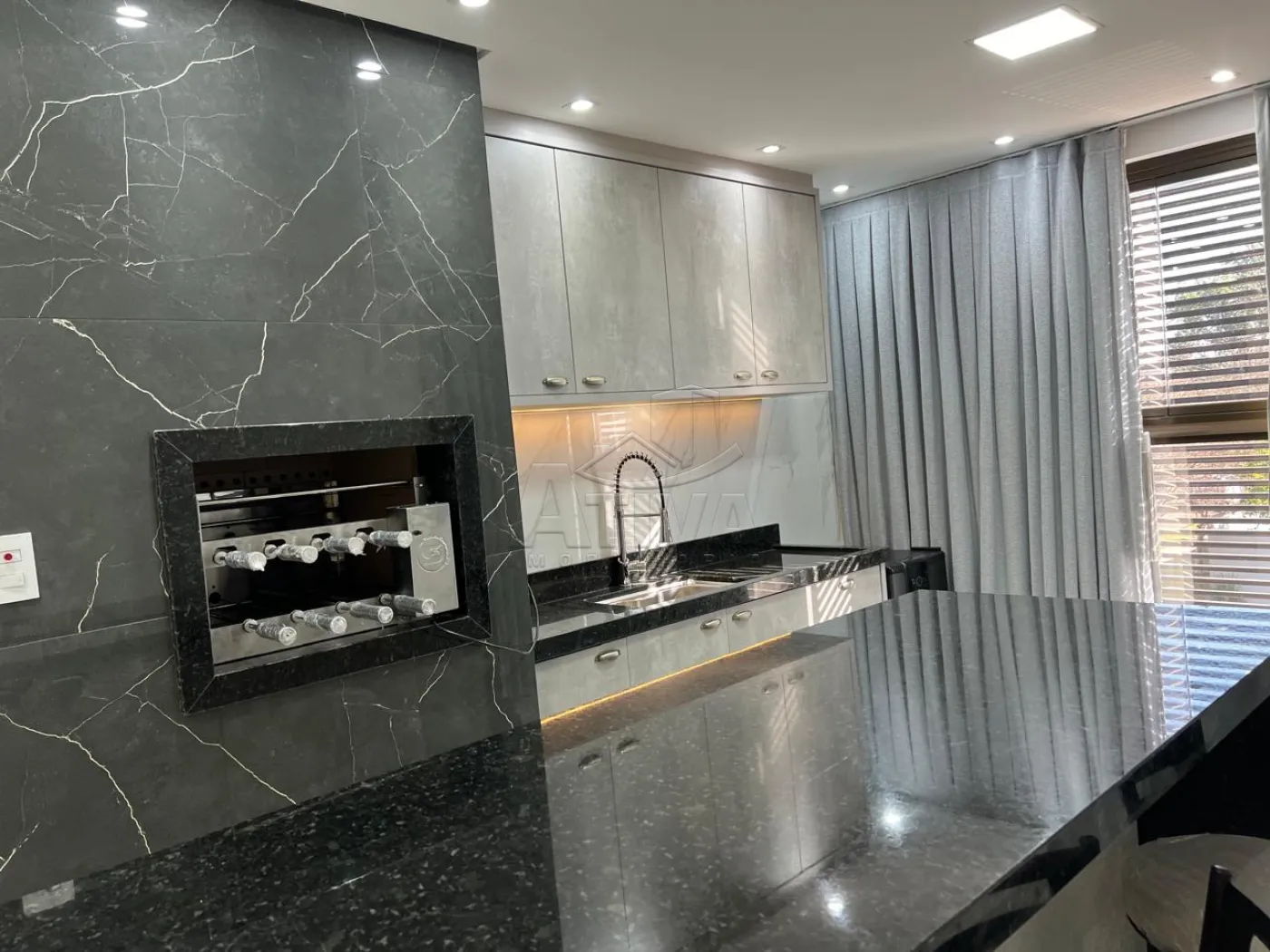 - Área gourmet com churrasqueira giratória , armário , torneira , bancada , banquetas .