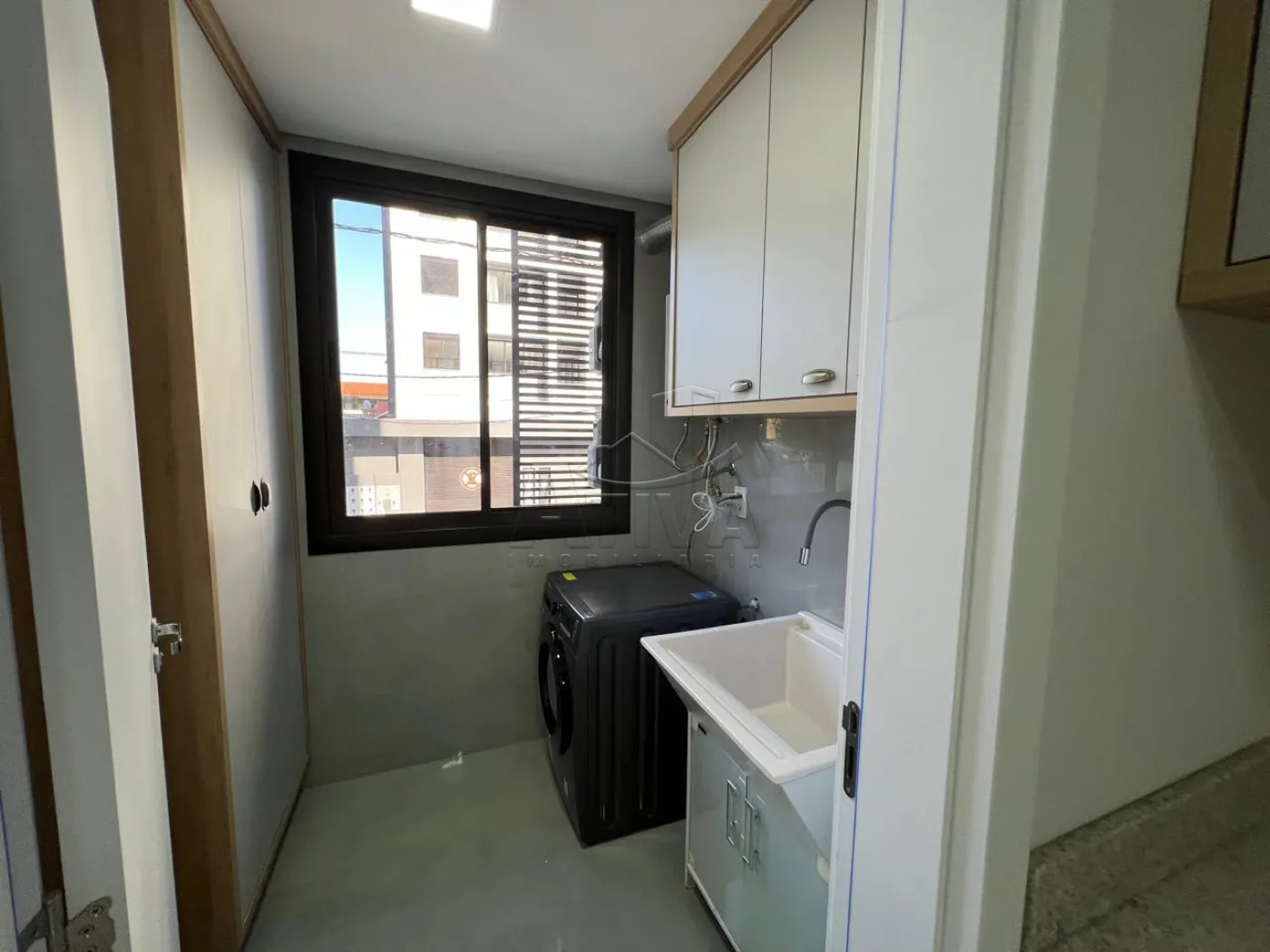 - Área de serviço com tanque de lavagem , máquina de lavar , armário .