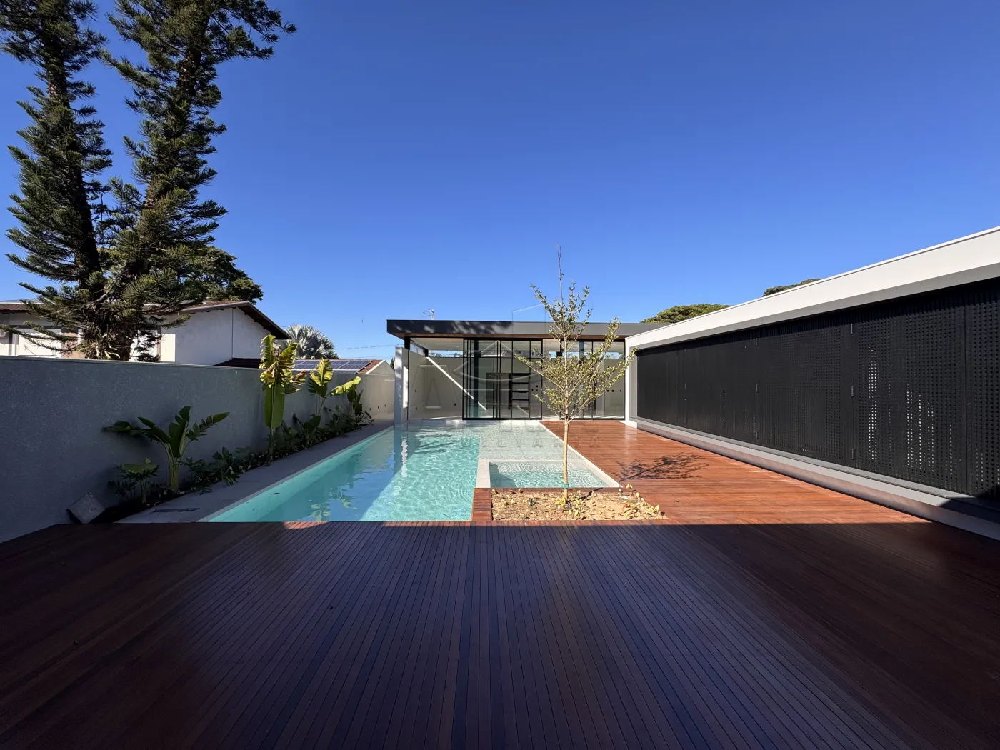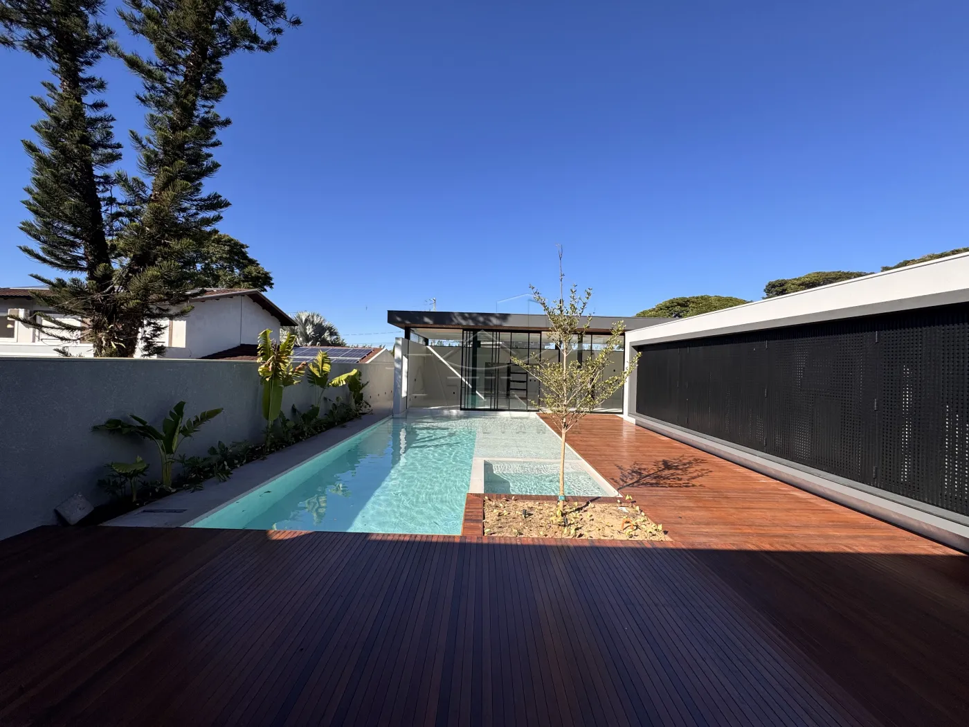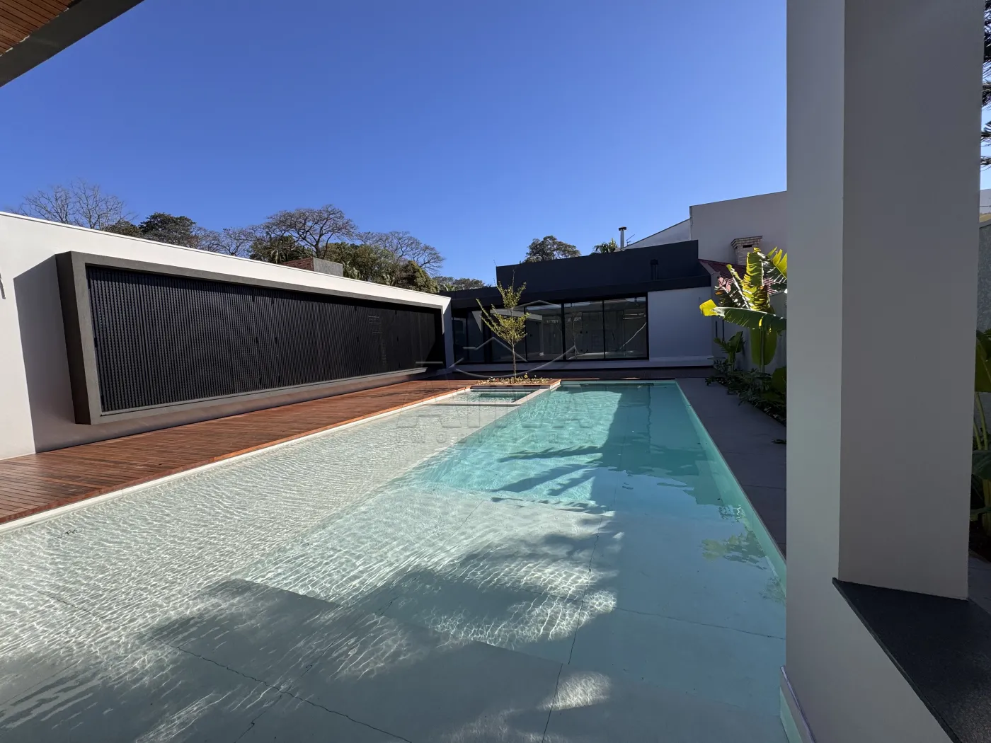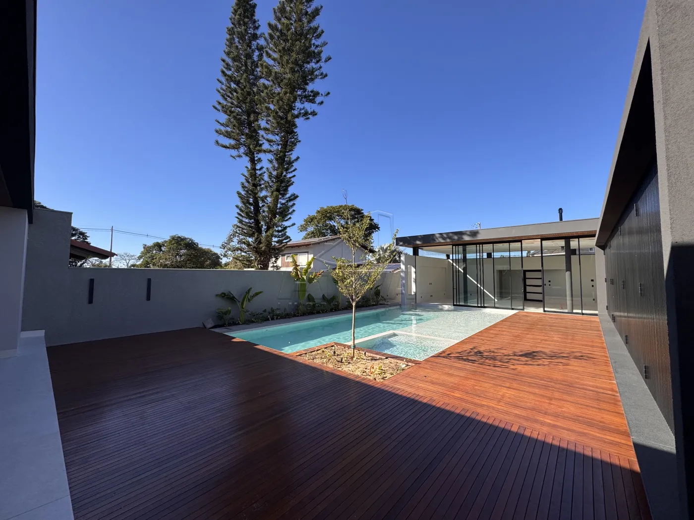 - Piscina com deck molhado para cadeiras de sol, toda porcelanato . Visor de vidro com vista para a Adega ,Spa com hidromassagem e chess esculpida.