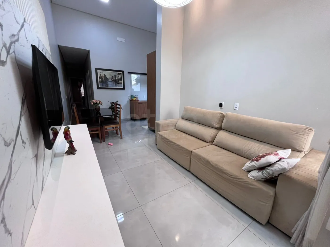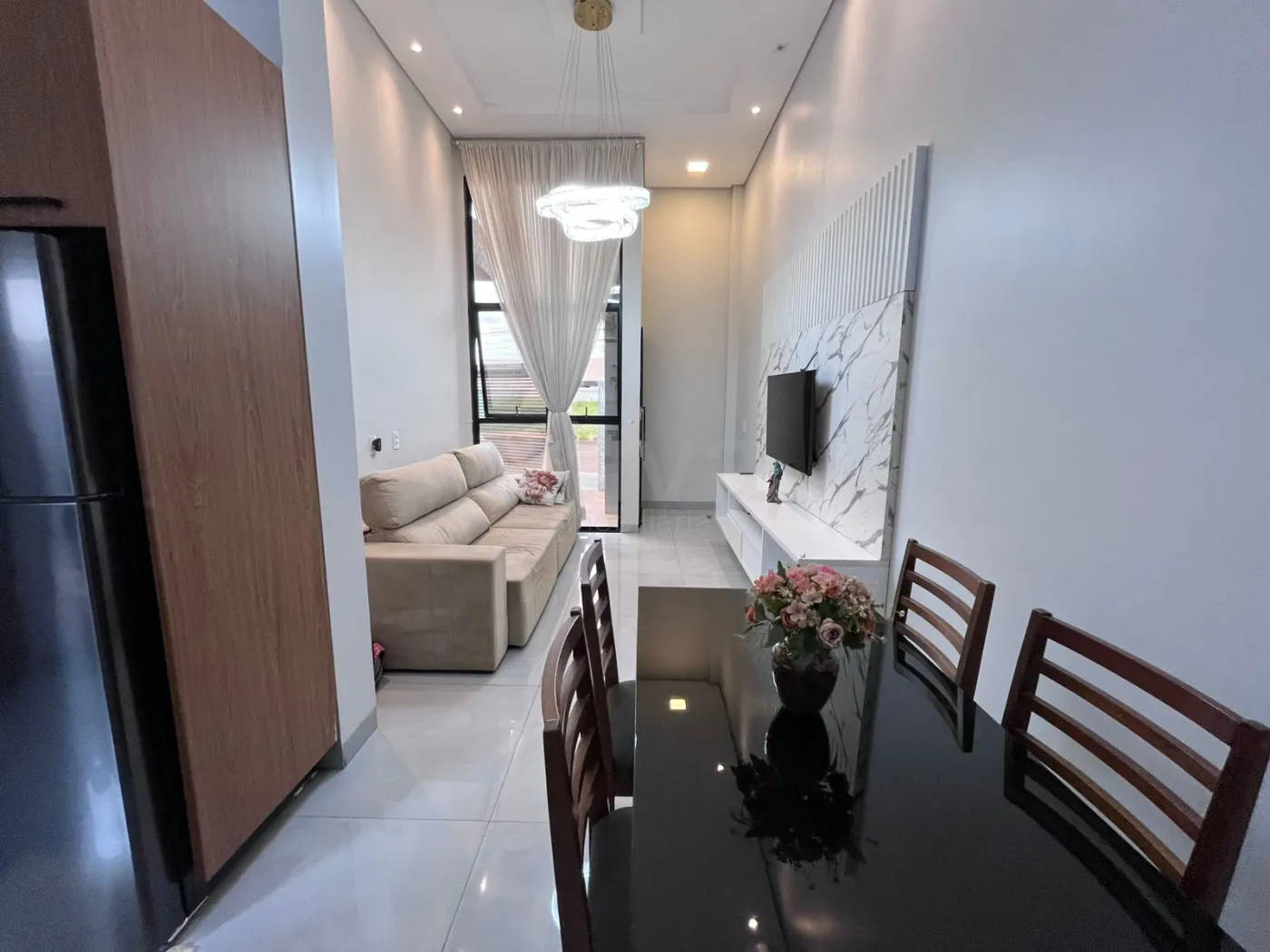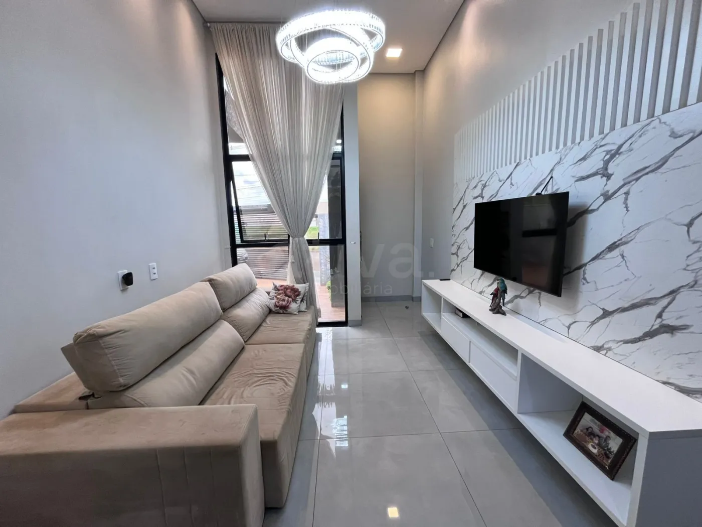 - Sala de Estar com painel de televisão , lustre e cortina
