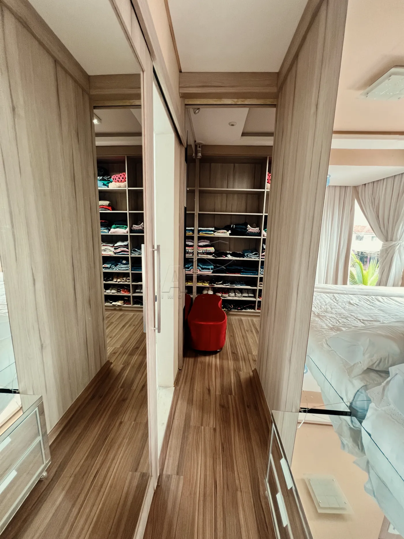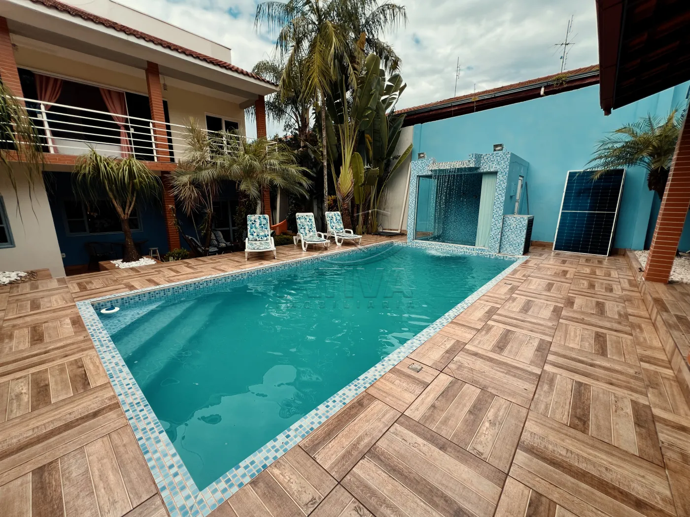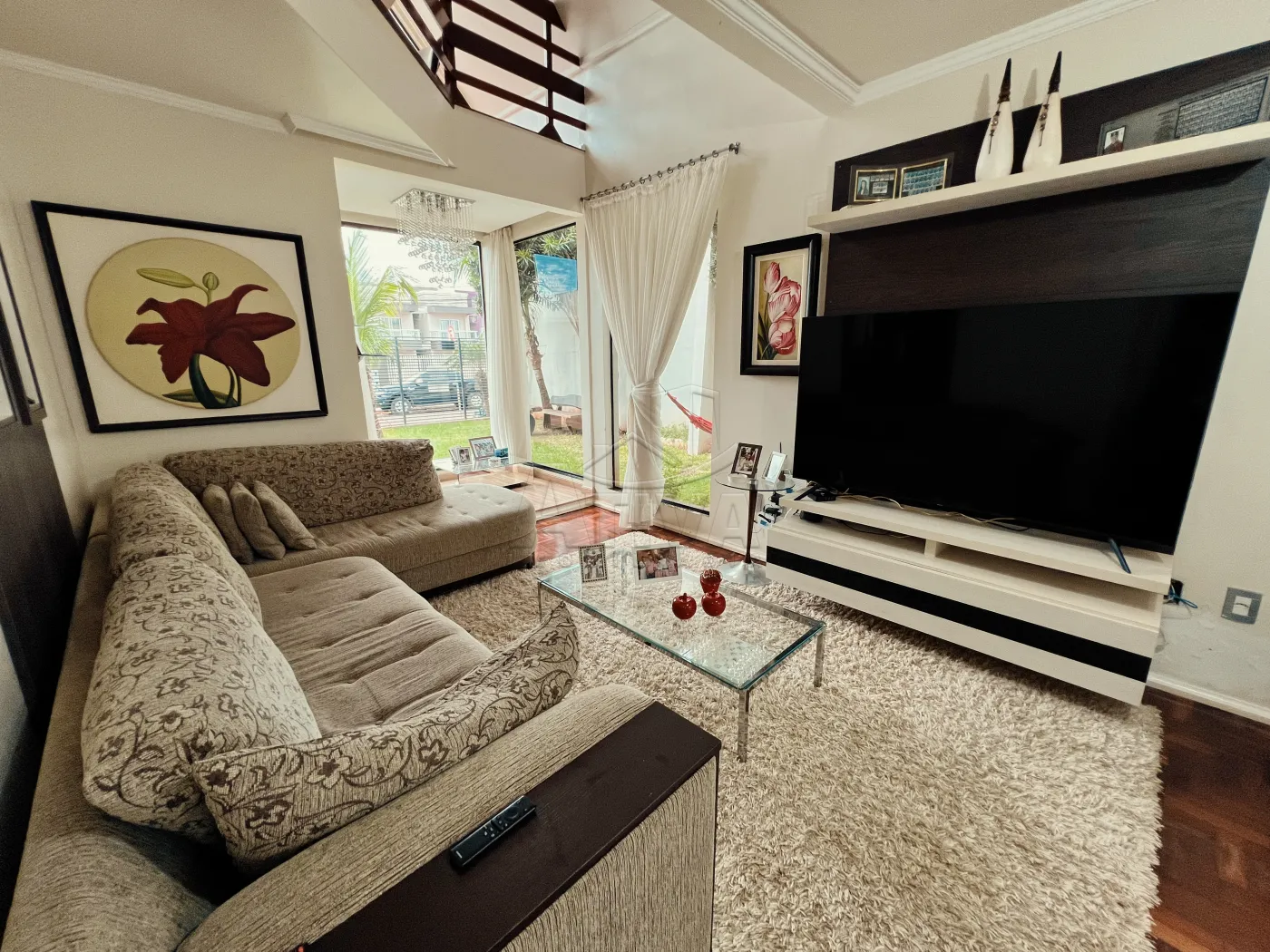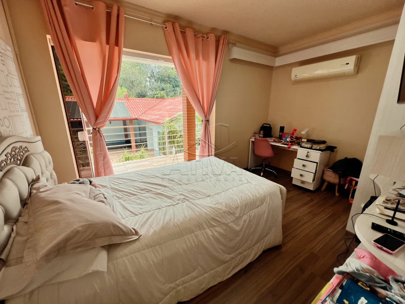 Sobrado com 3 quartos, 1 suíte, sala de estar, sala de jantar, cozinha planejada, 4 WC (suíte+serviço+social+lavabo), ar condicionado, piscina aquecida com cascata, sauna, área de festas com churrasqueira e 3 vagas de garagem. Possui aberturas em madeira, piso porcelanato e madeira, teto de laje e gesso rebaixado, aquecimento à gás, sistema de alarme, videofone, portão eletrônico.